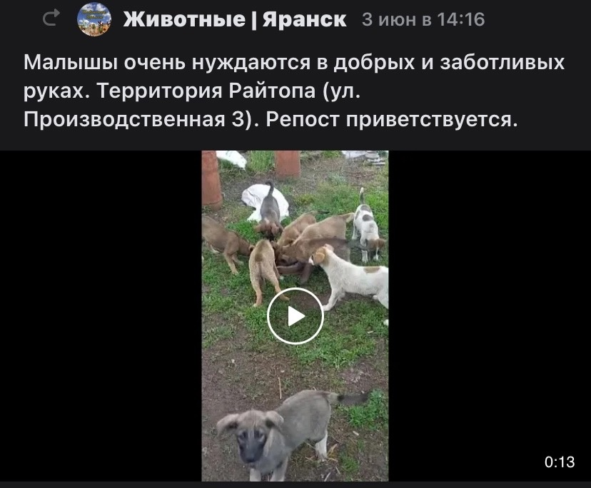 В сообщения группы обратились девушки-волонтеры с криком о помощи. На федеральной трассе недалеко от Яранска бегала целая стая щенков, скорее всего от них кто-то избавился, просто оставив на дороге. Щенки были очень истощены, карапузы находились просто в ужасном состоянии. Нужно было срочно что-то делать, кроме нашего приюта на помощь волонтерам из Яранска никто не откликнулся. В приют таких маленьких щенков без прививок брать крайне опасно, поэтому мы решили через попутчиков отправить прививки город Яранск и после двух вакцин забрать их в приют. Доставив прививки Яранск щенков не оказалось на месте, малышей забрал отлов, который на них вызвал кто-то из местных жителей. Мы опоздали всего на пару часов. Было принято решение разыскать щенков и узнать о дальнейшей судьбе. Щенков забрали в одну из передержек в город Киров, дальнейшая судьба малышей была неизвестна. Девушки волонтеры из Яранска твердо решили отыскать их и все же забрать, спустя вре
