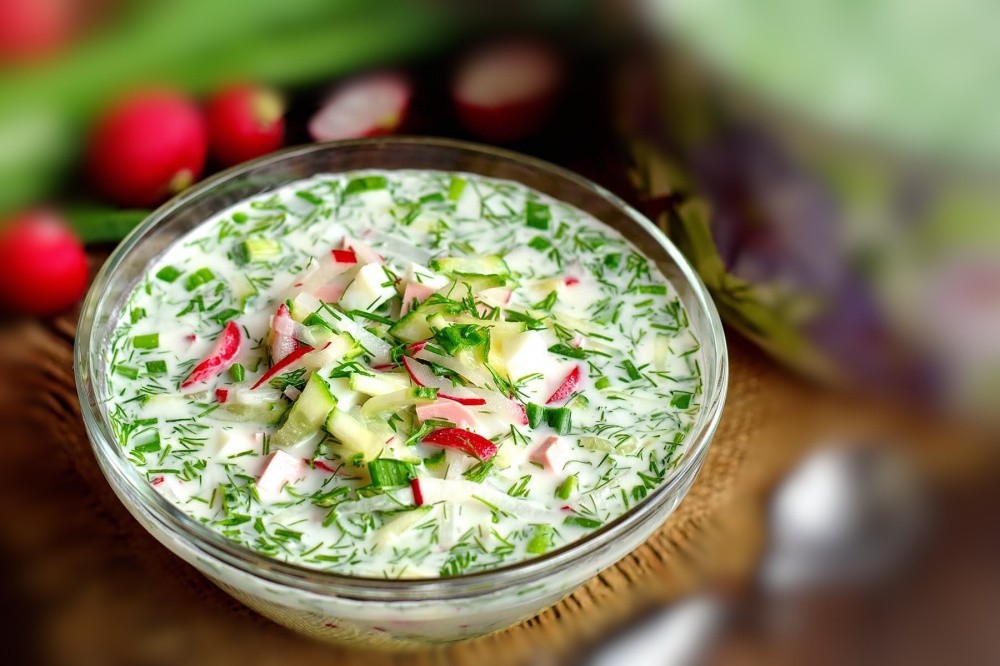 Промываем и обсушиваем овощи и зелень. Мелко нарезаем зеленый лук и укроп, растираем с желтками солью и горчицей (если Вы добавляете), так будет вкуснее и ароматнее;) Отварной картофель, огурец, редис, ветчину, белок от яйца, нарезаем мелким кубиком, соеденяем с растертой зеленью, заправляем сметаной и тщательно перемешиваем, только потом заливаем холодным квасом, доводим до вкуса (соль, перец, горчица), и наслаждаемся вкусом и прохладой;) Освежающая окрошка на квасе с ветчиной, овощами и свежей зеленью - спасение для жарких дней!) Основа из отварного картофеля, яиц и ветчины отвечает за питательность блюда, добавление укропа и зелёного лука - привнесет свежесть, а заправка из холодного кваса - приятно охлаждает. Готовка занимает не