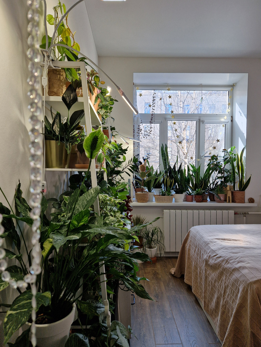 Про соразмерность. Все мы тут опытные растениеводы и знаем, что горшок нужно подбирать по размеру корневой системы растения, иначе залив/не растут вершки/вообще не нравится зелёному другу много места, он любит клаустрофобию. И вот здесь очень часто бывает так, что крона сильно визуально перевешивает горшок. Растение прям неустойчиво выглядит. И действительно может упасть, вершки перевесят корешки. Что я делаю? Я практически всегда использую прозрачный пластик с дырочками на дне в качестве горшка и ставлю его в кашпо (это может что угодно: кашпо, горшок, чашка, корзина, мешок, ящик, etc). В соразмерное кроне кашпо. Таким образом мы добиваемся устойчивости во всех смыслах, можем менять "наряды" хоть три раза в день, ну и за корнями подглядывать удобно). Дальше посмотрим чуть шире - ваш устойчивый зелёный друг в кашпо и его окружение. Крупный экземпляр может стоять один, гордый и величественный, рядом с креслом, например. Грядка из малышей как правило просится в группу. Рядом с изящным буфетом на тонких ножках хорошо привстанет изящный же зелёный, они не будут "давить" друг на друга. В общем, соразмерность растения в кашпо и его соседей также должна быть учтена. Хотя бы чуть-чуть. Ну и повторюсь, как и с кучкой маленьких растений, так и с кучкой разноразмерных, когда их очень много (а у вас много, я знаю), хорошо работает группировка. Разноуровневая (многоярусная) особенно.