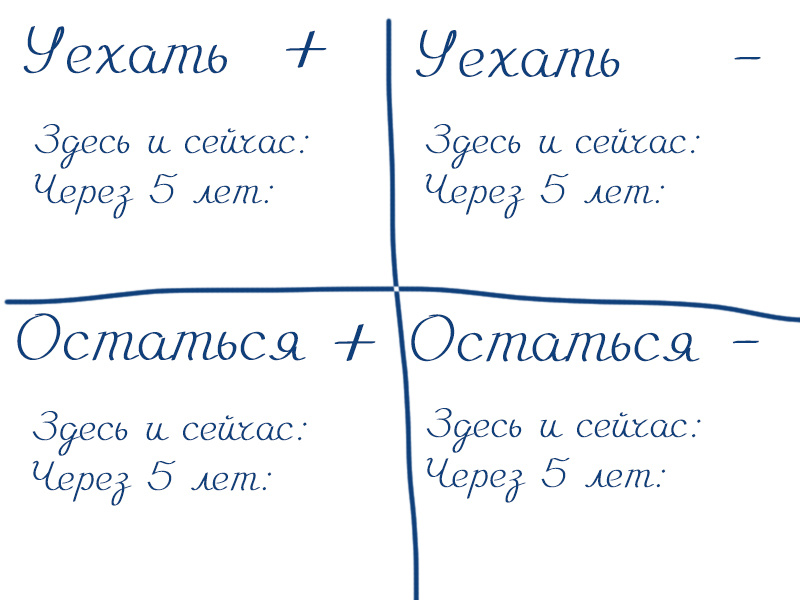 Приветствую вас, дорогие читатели! Часто люди обращаются к психологам, когда перед ними стоит сложность выбора в какой-то жизненной ситуации. Нам всем часто сложно принимать решения, когда вопрос касается глобальных изменений в нашей жизни. Например, переезжать ли в другой город, если карьерные перспективы там хорошие, а близких и друзей у нас там нет. Разрывать ли отношения с партнером, с которым мы много лет вместе, но уже много месяцев с ним нет интимных отношений, да и финансово он не состоятелен. Бывает сложно принимать решения и в простых бытовых вопросах. В такие моменты у сомневающегося человека может развиться тревожность, депрессивность, пассивность, что существенно снижает качество жизни. В ситуации, когда клиенту сложно принять решение, я предлагаю ему сделать технику из КПТ подхода под названием «Мотивационный квадрат». Для выполнения данной техники необходимо расчертить таблицу, состоящую из 4 блоков. В этих блоках будет 4 варианта решения проблемы: 2 блока с положительны