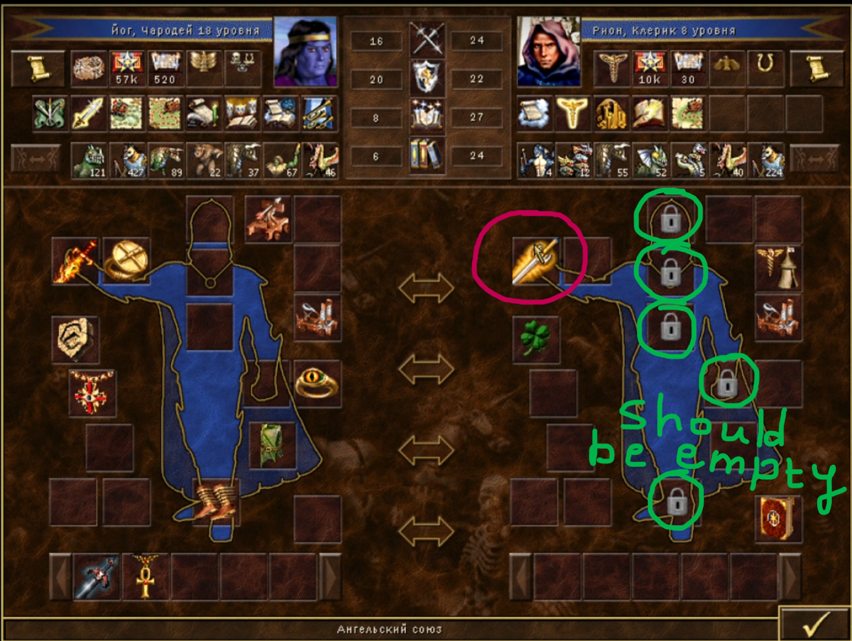 Покажу где найти Клевер фортуны/удачи, чтобы попасть в замок Дедвуд, а также где найти Дивный доспех и Сандалии святого. Идём по вопросам и потом покажу прохождение сценария тем, у кого возникли трудности. Игру мы начинаем с мечом Ангельский альянс (Angelic Alliance) и его можно разделить на артефакты (справедливости ради, я это сделала только в самом конце игры), но и после разделения собрать меч обратно тоже можно, для этого все полученные от меча артефакты должны быть на герое. Чтобы разделить Ангельский альянс на артефакты, нужно положить его в руку герою (любому), как на фото и потом кликнуть по нему правой кнопкой мыши. P.S. Розовым выделен меч, а зелёным обведены ячейки, в которых не должно быть никаких артефактов, иначе меч Ангельский альянс не получится взять в руку, потому что при расколе меча, он положит туда 5 новых артефактов, в общем освободите место под них! После раскола меча Ангельского альянса на герое появляются следующие артефакты: Меч правосудия (Sword of Judgeme