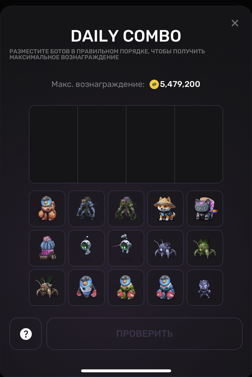 Дейли Комбо в PixelTap на сегодня 18 июля. Расположи персонажей с картинки в правильном порядке и забери награду. Чтобы награда была выше - открой новых питомцев и прокачай старых. Как собрать комбо дня в PixelTap PixelVerse: 1. Заходите в нижнем меню в "Награды -> Daily Combo". 2. Перетаскивайте карточки нужных персонажей в ячейки в том же порядке, как на картинке. Если ты еще не присоединился, то я бы советовала поторопиться 😉