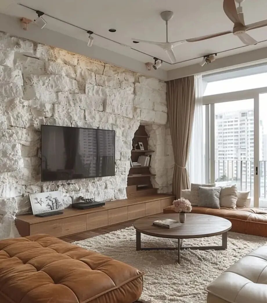 Включите натуральные текстуры и материалы в декор вашей гостиной . Используйте деревянные журнальные столики, каменные акценты и льняные подушки, чтобы создать теплое, уютное пространство.