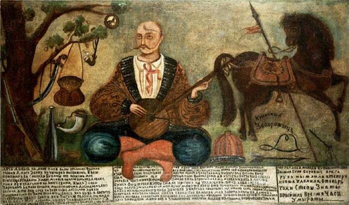 Почти все изображения Мамая сопровождались подписями, прославлявшими его свободу, богатство и – главное – отсутствие необходимости трудиться. Самые обычные и короткие: «Я казак Мамай, меня не занимай [т.е. не отвлекай]» или «Сидит козак, на кобзе играет, а что ни пожелает, то всё имеет». Более длинные надписи часто исполнены с такими сочными украинскими выражениями, что в печатном тексте их неудобно воспроизводить даже переведёнными на русский язык.