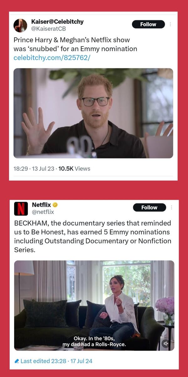 Грустную новость принесла я для Сассексов! Они в очередной раз проиграли в своей битве с Бекхэмами. Обе эти пары были представлены Netflix в документальных биографических фильмах: Сассексы в 2022 году, сериалом "Гарри и Меган", Бекхэмы в 2023 году, сериалом "Бекхэм".