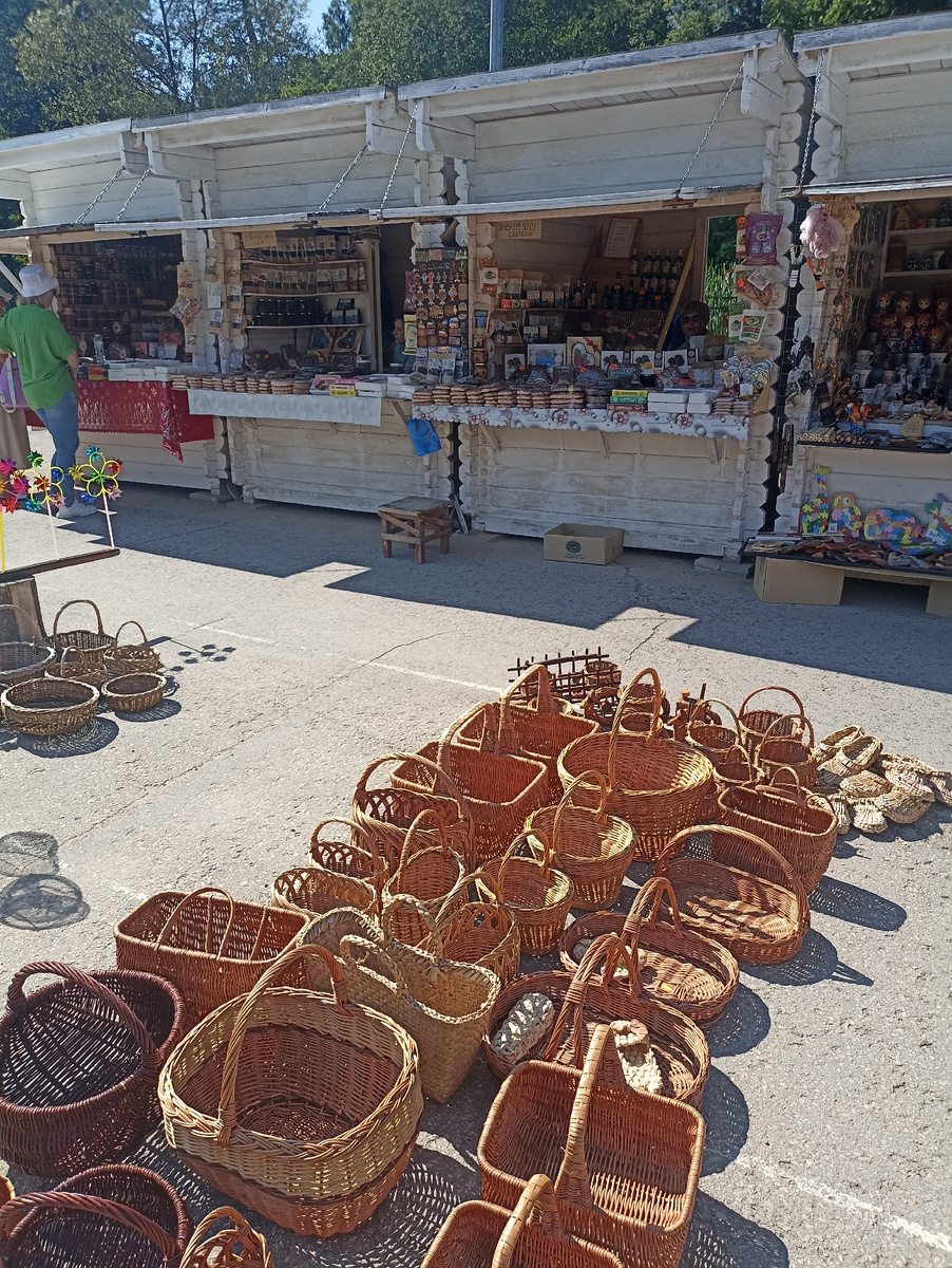 Возле парковки организованы торговые ряды. Набор продукции стандартный - пряники, белевская пастила, берёзовый квас, поделки из лозы, магнитики, картинки с видами Ясной Поляны и прочее. Цены примерно такие же, как и в самой Туле. Я ориентировалась на стоимость пряников и белевской пастилы.