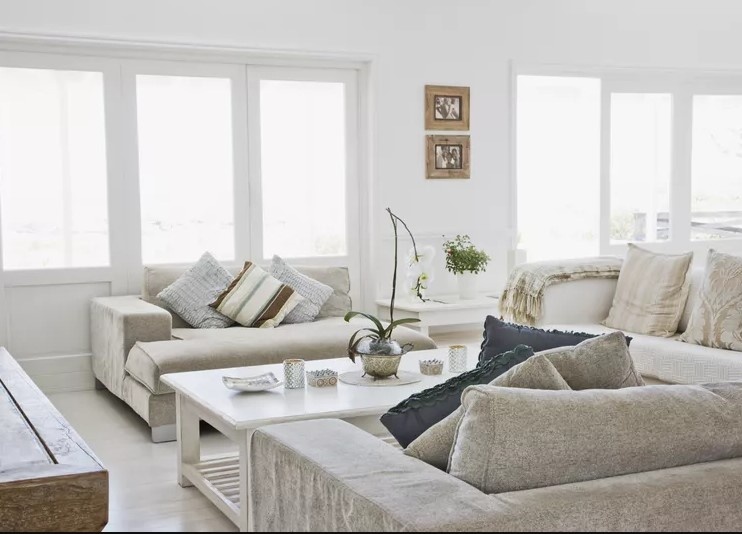 Этот интерьер демонстрирует, как эффективно использовать теплые нейтральные оттенки. Мягкие льняные кресла с подушками в нежных тонах и пушистые пледы сразу создают атмосферу уюта. Стены окрашены в теплый песочный цвет, а на них висят простые фотографии в рамах из натурального дерева. Сухие цветы также способствуют добавлению теплоты в интерьер.