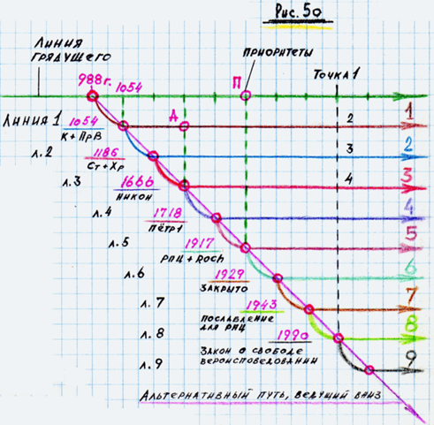 Сейчас, если взять что в 19 веке продолжительность была 140-150 лет, а сейчас в 3 раза меньше. А почему? - А потому что от Линии Грядущего ушли еще дальше. Ведь у нас, заметьте, сколько? Вот здесь был (линия 4 на рис. 1 или рис.50 у Расы) 18 век, а потом 1917, 29, 43, 90, 97, 2003 - все вот эти отходы, отходы, отходы и они уводят, Линия - Альтернативный путь (на рис. 1 или 50) отходит от Линии Грядущего. А чем дальше от основы, тем меньше подпитки, какой? Вселенской. Человека же что подпитывает? - Вселенская сила. А если человек от неё отдален, подпитки нет, человек раньше и погибает, физиологически даже - слабеет. Поэтому и его уровень жизни совершенно другой.