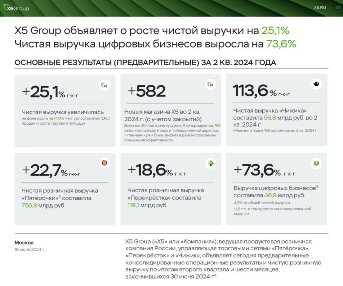 Вчера компания X5 Group опубликовала операционные результаты за II квартал и 1п. 2024 года. По итогам 1 полугодия: — Общие продажи компании выросли на 25,9% (1,8 трлн руб.); — Средний чек +11,6%; — Количество покупателей +13,1%. На 30 июня 2024 года компания насчитывает: — 21997 магазинов «Пятерочка» (+689 с начала года); — 987 магазинов «Перекресток» (+15 с начала года); — 1785 магазинов «Чижик» (+285 с начала года). Значительный рост и вклад в общие достижения компании вносит быстрорастущий дискаунтер «Чижик», чистая оффлайн выручка которого выросла на 112,9% во II квартале. Также свой вклад вносят цифровые бизнесы компании (включая X5 Digital, 5Post и Много лосося). Основными факторами такой динамики являются: растущая инфляция, сильный рынок труда, рост реальной заработной платы, фокус компании на укрепление своих позиций в ключевых регионах и расширение своего присутствия и доли рынка. Хватит о цифрах! Здесь достаточно нескольких слов: «X5 Group явный фаворит в своем секто