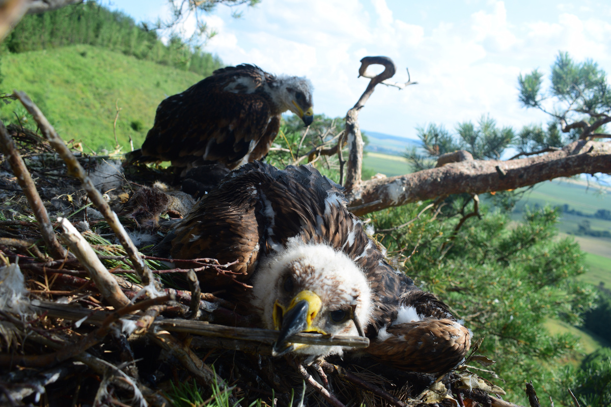 Дождавшись, когда родители покинут гнездо, орнитолог Ринур Бекмансуров начал своё восхождение. У входа в дом в угрожающей позе его встретил один из птенцов. Орнитолог поздоровался с ним и похвалил за реакцию. Второй в это время лежал спиной и мог только по звукам догадываться, что что-то пошло не так. Встречаться с опасностью лицом к лицу он не захотел, и поэтому замер. Проделав все манипуляции и определив, что смелый птиц – самец, а скромный и крупный птиц – самка, Ринур пожелал им расти большими, ничего не бояться и удалился. Во время кольцевания возникли сомнения относительно возраста птенцов, так как оперение самца как будто было развито больше и тогда самец – старший птенец, но длина крыла говорила об обратном. В конечном итоге решили, что старший птенец – самка. Девочку назвали Елга (переводится как «река» с татарского), а мальчика – Инеш (переводится как «ручей» с татарского). Но до того, как орнитолог дал им официальные имена, наблюдатели между собой их ласково называли Тихон