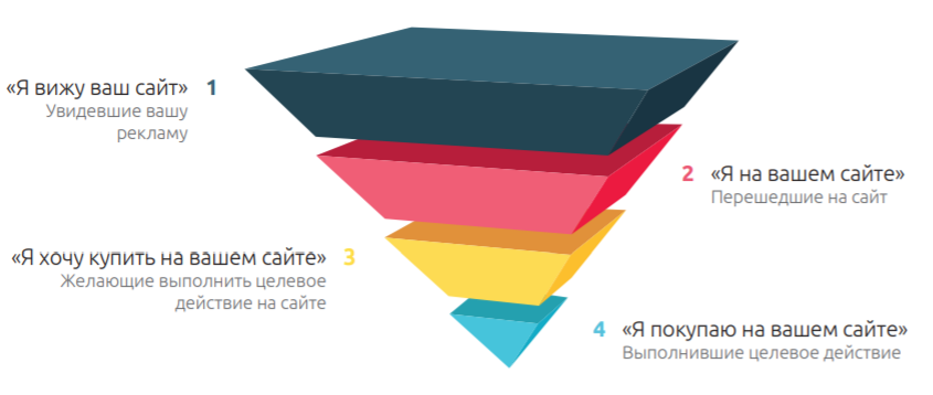 Выбор маркетингового канала определяет эффективность первого этапа воронки продаж – одного из самых эффективных инструментов аналитики в маркетинге. Воронка продаж – это метод измерения и увеличения продаж или целевых действий на сайте путем вычленения этапов достижения конечной цели с распределением по ним пользователей (для увеличения числа совершивших целевое действие и уменьшения тех, кто прекратил активность на каком-либо уровне). Воронка продаж Залейте в воронку больше посетителей и считайте эффективность на выходе. На рисунке приведена универсальная модель воронки продаж. Она может состоять из множества этапов, а может быть такой, как на рисунке. Сразу стоит сказать, что мы не включили в воронку вернувшихся на сайт посетителей, так как считаем их обособленным звеном, требующим отдельного рассмотрения. Главный постулат воронки продаж: чем больше она похожа на куб, тем лучше. Анализируя и прорабатывая каждый этап, вы тем самым расширяете его, а за ним расширяете и другие, получая
