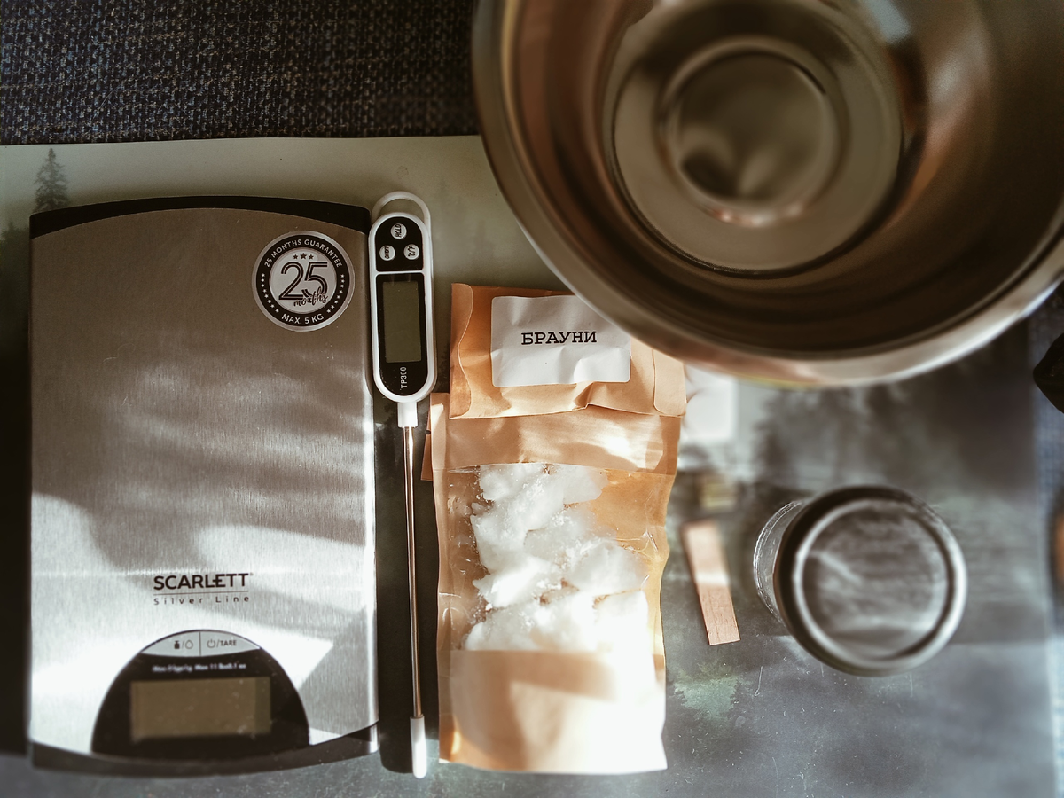 Прошло уже прилично времени с момента, как набор из обзора ко мне приехал. Но потребовалось еще подождать, когда а) немного спадает жара, т.к. на кухне и без того ад, б) найдется подходящая ёмкость, в) приедет кулинарный термометр. Наконец, когда все было собрано, найдено, а настроение - позволяло творить, можно было начинать! И сегодня покажу, расскажу, как сие было. Начинаем. Подготовка рабочего места - важный этап. Что нам требуется: 1. Весы, чтобы понимать, сколько воска и сколько отдушки. 2. Термометр с щупом, чтобы следить за температурой воска. 3. Комплект из набора: воск, фитиль, фитиледержатель, наклейка под него, баночка для заливки 4. Ёмкость для растапливания воска. Лучше найдите с какой-нибудь ручкой, поскольку я пару раз чуть не обожглась. 5. За кадром: большая кастрюля, силиконовая кисть. 6. За кадром №2 - деревянная разделочная доска, ибо нагретую металлическую тару более некуда было ставить. Соответственно, как я и писала в обзоре - помимо набора, у Вас должны быть е