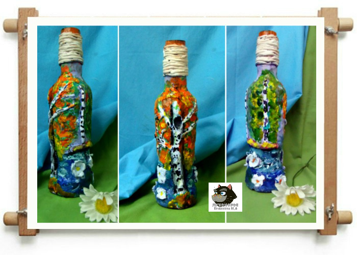 Начинаем работу с подготовки поверхности бутылки к росписи. Всю поверхность бутылки, кроме донышка, необходимо облепить тонким слоем пластилина. Затем нужно скатать длинную тонкую колбаску. Из неё мы сделаем декор для горлышка, нужно обвить колбаской горловину( спиралька). Теперь будем лепить ствол главной берёзы. Скатываем колбаску среднего размера, длинна должна соответствовать высоте изделия. Расплющиваем пальчиками и закрепляем на на поверхности бутылки. Таким же образом лепим несколько больших ветвей берёзы и закрепляем у ствола. Таким образом у нас получается рельефный пейзаж. С другой стороны бутылки расположем еще два ствола берёз поменьше, примерно в пол высоты изделия. Под ними расположим расплющенную колбаску пластилина-это береговая линия. Наши берёзы стоят на берегу водоёма с белыми лилия
