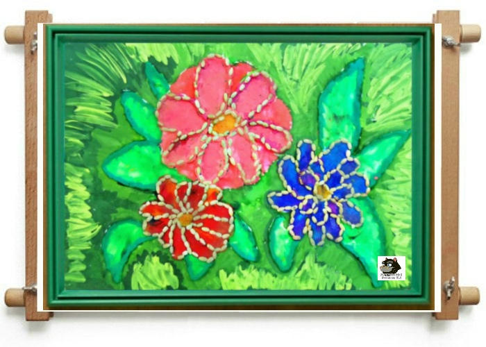 Начинаем лепку первого цветка. Для каждого его лепесточка смешиваем между собой два маленьких кусочка пластилина-жёлтый и красный, но не сильно, однородный цвет нам не нужен. Затем скатываем соединённый пластилин в небольшие морковки, располагаем на листе картона в форме цветка и расплющиваем, тем самым закрепляя пластилин на поверхности работы. Сердцевину цветка делаем из расплющенного шарика. Для второго цветка смешаем синий с фиолетовым, также прикрепим к листу. Затем поверх первого слоя лепестков вылепим ещё один ряд, но лепестки уже будут более меньшего размера. Потом сердцевина, её вылепливаем из остатков смешанного пластилина для первого цветка. Для самого большого цветка в композиции возьмём розовый пластилин двух разных оттенков. Пластилин примазываем к картону маленькими