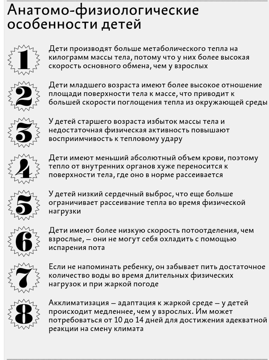 Дети быстрее, чем взрослые, перегреваются на солнце и легче получают солнечные ожоги. Это связано с особенностями функционирования детского организма. Чаще у детей возникают ожоги первой степени, которые характеризуются интенсивным покраснением кожи и болезненностью. Но чем младше ребёнок, тем более нежная и чувствительная у него кожа. И больше риск получить ожоги более тяжёлой степени с волдырями и отслоением кожи. 1. Не надо обмазывать ребёнка кефиром или сметаной! Пища загрязнит раневую поверхность и приведёт к воспалению. 2. Не использовать мочу ! Её раздражающие свойства вызывают воспаление. 3. Не использовать средства, содержащие жиры- жирную сметану, жирный крем, вазелин! Они создают плёнку на коже, которая не даёт ей охладиться. Температура в месте ожога повышается еще больше, увеличивается глубина и площадь ожоговой поверхности. 4. Не вскрывать волдыри! 5. При нарушении сознания нельзя тормошить ребёнка, трясти, оглушать его криком, прижимать к себе! 1. Увести ребёнка от со