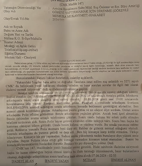 После этого другая сотрудница увела их в отдельный кабинет без камер видеонаблюдения, где избила по лицу и по голове. Далее россиянки отправились в увлекательное путешествие по турецким КПЗ: у них сняли отпечатки и предоставили переводчика, с которым женщины направились в суд.