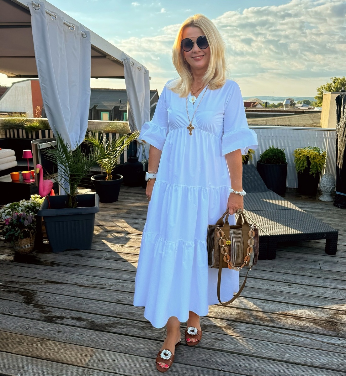 Белый цвет идеально подходит для жарких летних дней. Он освежает внешность, красиво подчеркивает благородный загар. Сегодня рассмотрим 12 безупречных образов в белом от блогеров элегантного возраста. Белоснежное платье даже в повседневном стиле выглядит роскошно! Шлепанцы гармонируют по цвету с сумкой, утонченные украшения ничуть не перегружают летний сет. Юбка с перфорацией не препятствует свободной циркуляции воздуха. Макси – один из ключевых трендов сезона. Длинную юбку можно носить со свободным "верхом", изящными босоножками. Соломенная шляпа подчеркивает летнее настроение. Не хуже на леди 50+ смотрится длинный сарафан с перфорацией. Красиво, женственно и не жарко! Детали: коричневые босоножки, крупная бижутерия. Брюки из светлого денима – удачный сезонный выбор. Белый отлично сочетается с освежающим травяным зеленым цветом. Морковная сумка и босоножки аналогичного цвета дополнительно "оживляют" наряд. Уверенные в себе модницы смело экспериментируют со стилем. Юбка с асимметр