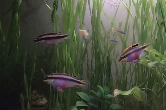Пары можно держать даже в просторном общем аквариуме. За исключением нерестового периода, относительно мирный вид. Обязательны укрытия, если их не хватает, рыбы выкапывают под корнями растений или камнями ямки, где и скрываются. Плотная растительность. В отношении качества воды попугаи не очень требовательны, важно лишь регулярно делать ее частичную подмену. Рекомендуемый температурный диапозон: 21-27 °С. Мягкая вода (10 °dGH). Корм для всеядных рыб. Сухой корм, мороженый корм, живой корм. Размножение. Удается и в просторных общих аквариумах. Родители выбирают пещеру и мечут там до 200 икринок. В зависимости от температуры мальки начинают плавать через 8-14 дней. Стартовый корм - науплии артемии. Родители несколько недель охраняют потомство. Видео: Ц