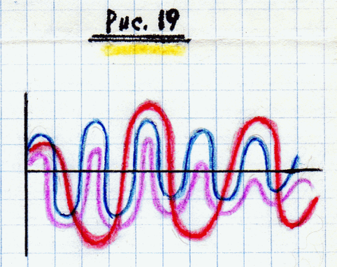 Когда одни человек говорит, его разговор, речь – это определенная волна (рис. 19 – синим цветом) с определенной амплитудой и с определенной частотой, так? А вы представьте, магнитная буря, что делает? Она превращает эту волну, допустим, вот в такую (сиреневым цветом). И человек вроде бы слышит-то слова нормальные, а мозг получает не синюю волну, а сиреневую. Т.е. человек воспринимает совершенно другие колебания и он не может охватить Образ передаваемой информации. И потом человеку кто-то говорит: Вы что? Вы смотрите, и не видите. Вы слушаете и не слышите. А слышит – то он всё прекрасно. Образная и визуальная структуры дают подтверждение. И слова вроде бы составленные из колебаний в определенной форме доходят, но они имеют иную поднесущую частоту, которая искажает, изменяет, и в голове совершенно другая информация идет. Либо, если человек - сенситив (?), т.е. он очень чувствительный, как говорят, экстрасенс, он на себе очень сильно чувствует влияние изменения магнитного поля Земли. И тогда он говорит людям одну информацию, а они слышат совершенно другое. Почему? Потому что при выходе из него информация не такая, как на рис.19, а вот так идущая (красным цветом), и она совершенно не совпадает. И многим кажется, что он несет какую-то абракадабру. И ему говорят: Что за бред ты несешь? Ты сам-то понял, что сказал? А он понял. Он пытается передать образ, но влияние вот этого магнитного поля, измененного, изменяет и передаваемый им образ. И это искаженный образ люди не воспринимают. Для них он чуждый. Он не поддается пониманию. А то, что человек не понимает, в нем вызывает чувство настороженности. Чувство настороженности, если это продолжается дальше переходит в негатив, а потом в агрессию против того, кто создает такие условия.
