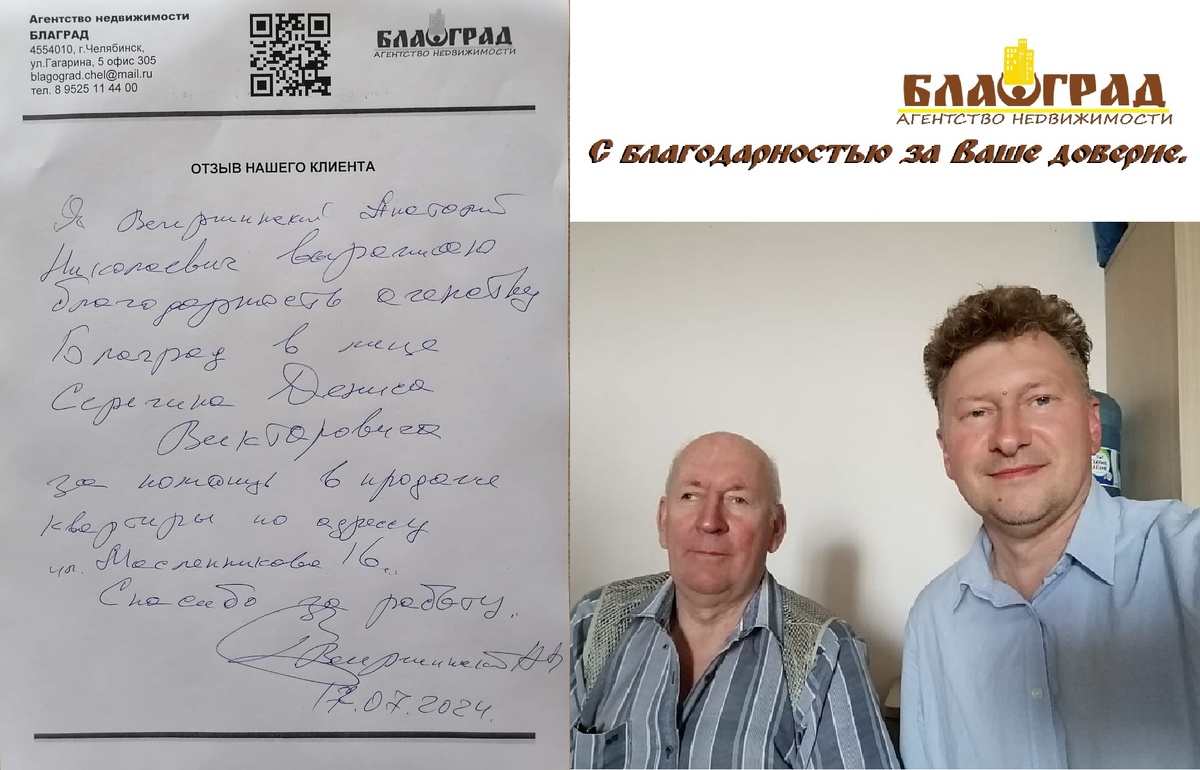 Я, Вегержинский Анатолий Николаевич выражаю благодарность агентству БЛАГРАД в лице Серегина Дениса Викторовича за помощь в продаже квартиры по адресу Масленникова 16. Спасибо за работу. Вегержинский А.Н. 17.07.2024г.