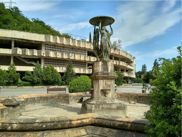 Мы продолжаем бродить по Гагре, а вы - читать и смотреть. Прошлый раз мы остановились у фонтана (сухого, как и речка), напротив заброшенного торгового центра "Жоэквара" Прошлись по нижней галерее - пусто и заброшено. Зато - есть тень. В парикмахерскую не пошли :) Зато, пошли по проспекту Ардзинба (первый президент Абхазии), глазея по сторонам. Над нами дворец принца Ольденбургского (Александра (Петровича) Константина Фридриха). Гагры принцу нравились и он стремился превратить это место в курорт европейского уровня (Ниццу). Он, даже, ресторан из Скандинавии заказал (ИКЕЯ?) в 1902 году - "Гагрипш" (точно ИКЕЯ, судя по названию). "Меню" ресторана :) На самом деле - очередные "рыбки" Церетели. Статью из википедии вы и сами прочтёте, а я предлагаю вам прочитать весьма ироничный роман Фазиля Искандера "Сандро из Чегема". http://lib.ru/FISKANDER/sandro1.txt Там принцу Ольденбургскому и Гаграм посвящена отдельная глава: "Когда в начале века он пришел к царю с проектом создания на Черноморском