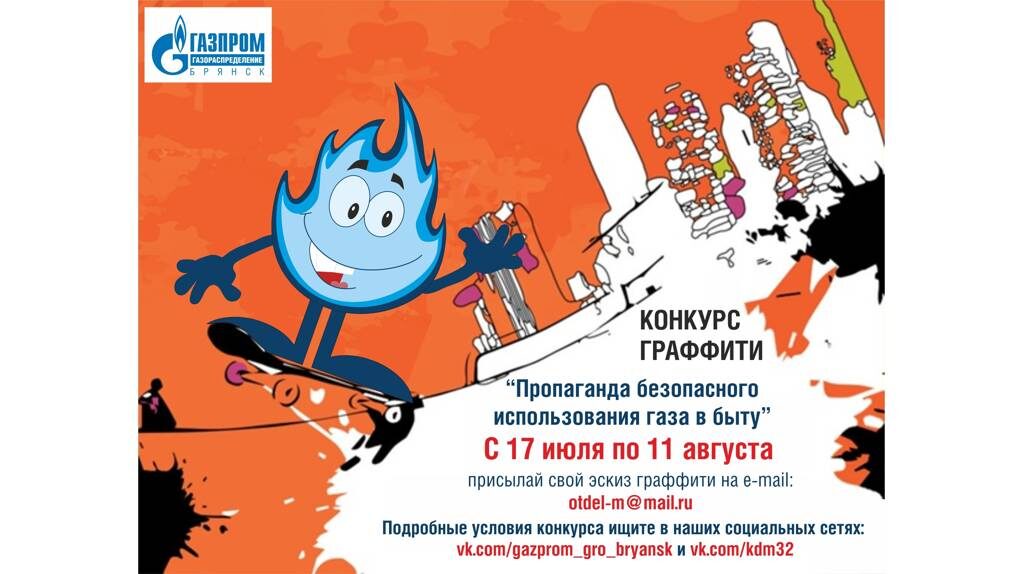 АО «Газпром газораспределение Брянск» объявило конкурс граффити. Стрит-арт художникам предоставляется уникальная возможность расписать фасады блочных газораспределительных пунктов в областном центре. В работах предлагается обыграть тему безопасного использования газа в быту. Участниками могут стать все желающие в возрасте от 18 до 35 лет. До 11 августа они должны подготовить макеты работ и подать их вместе с заявкой в отдел молодёжной политики комитета по делам молодёжи, семьи, материнства и детства Брянской городской администрации по адресу: улица Октябрьская, дом 103, телефон 74-56-95. К 13 августа экспертная комиссия выберет лучшие работы. Финалистам предоставят объекты для росписи по собственным эскизам. Этот этап пройдет с 14 по 21 августа. Накануне Дня работника нефтяной и газовой промышленности (до первого воскресенья сентября) победители конкурса получат призы. Брянские газовики объявили конкурс граффити