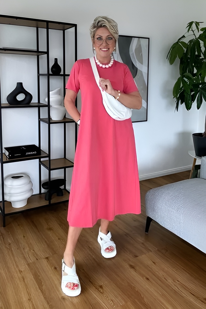 Розовый заметно омолаживает внешность, освежающий эффект можно усилить с помощью белой обуви и аксессуаров аналогичного цвета. Платье А-силуэта отлично моделирует фигуру, миди – оптимальная длина для модницы старше 50.