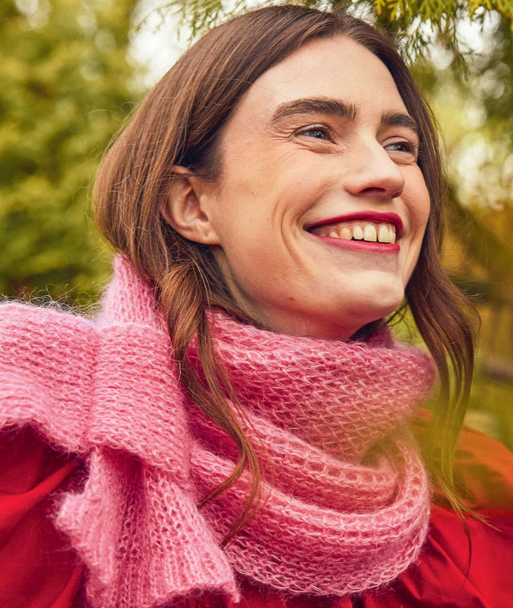 Этот аксессуар можно носить как угодно благодаря петле, через которую протягивается один конец шарфа и драпируется различными способами. Пряжа на основе мохера и шелка делает шар удивительно лёгким, несмотря на то что он вяжется нитью в два сложения.