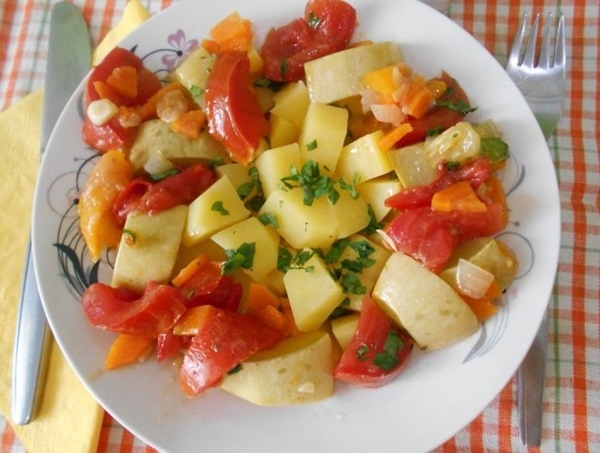 Наконец, положите в кастрюлю помидоры, готовьте ещё 5 минут, приправьте рагу солью и перцем. Слейте воду с картошки.