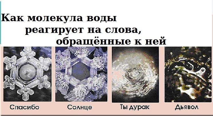 Результаты не разочаровали нас. Вода, которой показывали слово «спасибо», образовывала красивые шестиугольные кристаллы, тогда как вода, подвергавшаяся воздействию слов «ты дурак», создавала кристаллы, напоминающие те, что образовывались при воздействии тяжелого рока — уродливые обломки.