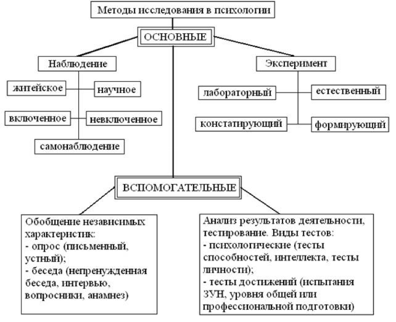 Психология, как и каждая наука, пользуется целой системой различных частных методов, или методик. Основными методами исследования в психологии, как и в ряде других наук, являются наблюдение и эксперимент. Каждый из этих общих методов научного исследования выступает в психологии в различных и более или менее специфических формах; существуют разные виды и наблюдения и эксперимента. Наблюдение в психологии может быть самонаблюдением или внешним наблюдением, обычно в отличие от самонаблюдения именуемым объективным. Внешнее, так называемое объективное, наблюдение может в свою очередь подразделяться на прямое и косвенное. Точно так же существуют различные формы или виды эксперимента. Разновидностью эксперимента является так называемый естественный эксперимент, являющийся формой промежуточной между экспериментом и простым наблюдением.