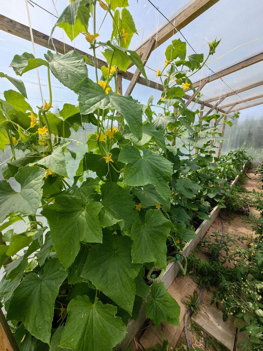 В прошлом году мне неоднократно сватали огурец сорта Китайский змей. Откровенно говоря, я ни разу не высаживала длинноплодные огурцы. Все время старалась выбирать более универсальные сорта. Правда, угадать с сортами мне почти никогда не удавалось. Пожалуй, лучшими были и остаются Герман и Наша Маша из опробованных. Но, тем не менее, я таки решила в этом сезоне высадить на пробу Китайского змея. Собственно, вот он, самый первый куст на фото. На фото с упаковки плоды не похожи. Семена у меня были от Гавриш. Гибрид плодовит очень, растет бодро, огурцов вагон. Казалось бы, живи и радуйся! Только все эти огурцы как один горькие. Просто чистый стрихнин! Половина огурца от плодоножки не съедобная совсем и вымачиванию не подлежит. Вторая половина огурца обычно менее горькая или даже съедобная. Зачастую идет на корм моим бородатым агамам, домовым сверчкам и курицам. Непосредственно рядом с Китайским змеем растут три куста Германа. Одинаковый полив, одинаковые условия, однако ни одного горького