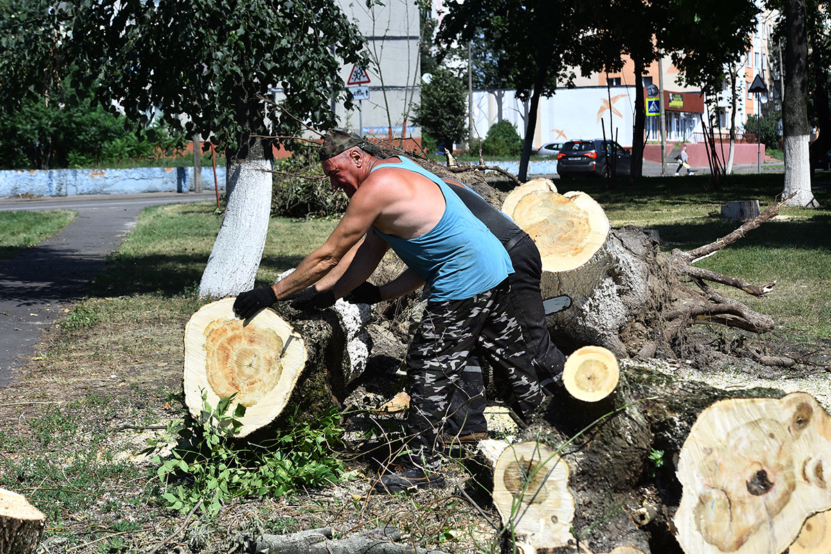 У дома №31 на Речицком проспекте поваленные ураганом деревья сегодня убирают бригады РЭУ-6 и ремонтно-строительного участка ГП «Советское». Среди работников есть те, кто устраняет последствия стихии с воскресенья. «Я был дома в тот вечер. Когда налетел ветер, сразу и не понял, что всё так серьёзно. Но вскоре позвонило начальство и попросило выйти на работу. Пока шёл на участок, увидел огромные тополя с перевёрнутыми корнями. Тут картина и прояснилась – на город налетел настоящий ураган», – вспоминает события вечера 14 июля рабочий по комплексному обслуживанию РСУ Павел Ковалёв. Бригада, в которую включили Ковалёва, работала на Сосновой, 4, примерно с 21 часа и до середины ночи. Распиливали и убирали перегородившее проезд дерево. С тех пор коммунальщики работают каждый день сверх нормы. «Ну а как иначе. Бурелома в районе очень много, и его нужно кому-то распилить и убрать», – говорит Ковалев. Всего в районе на базе госпредприятия «Советское» создано восемь бригад по распилу
