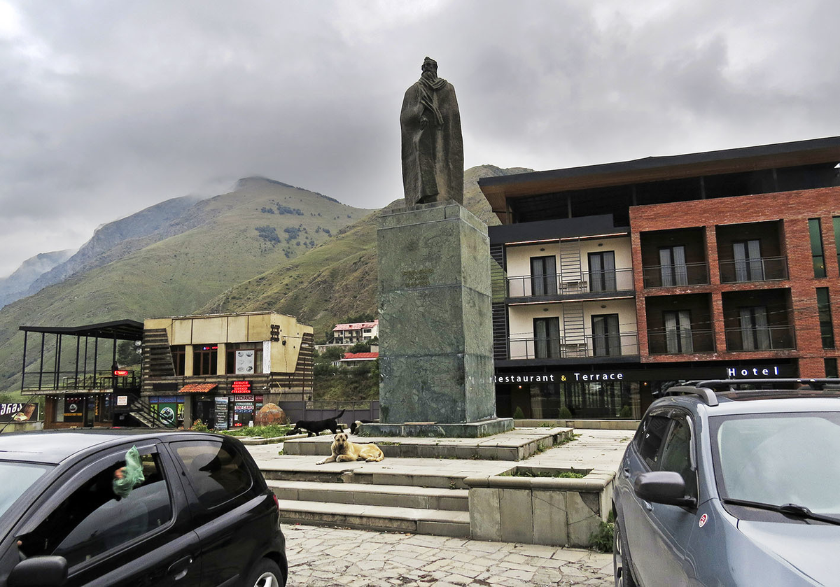На викимапии она значится площадью Сталина, и в Грузии такое название может быть, а может и не быть: с одной стороны, тиран, гулаг и все дела, а с другой - земляк же! Самый компромиссный вариант был бы назвать её площадью Кобы - ведь это прозвище народного мстителя из повести "Отцеубийца" писателя Александра Казбеги. Памятник ему (1959) - первое, что видишь, приехав в Степанцминду: