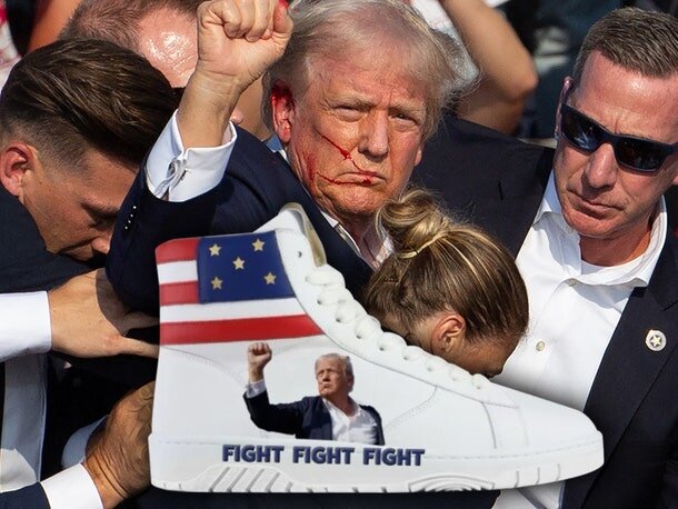 Веб-сайт, принадлежащий Дональду Трампу, продает кроссовки с культовым изображением бывшего президента США всего через несколько мгновений после того, как он был застрелен и чуть не убит… при этом ограниченная серия кроссовок стоит 299 долларов! И они быстро продаются. В дополнение к исторической фотографии на высоких крышах также написано: «Бой, бой, бой»… слова, которые Трамп выкрикнул через несколько мгновений после того, как стрельба утихла. По данным сайта, было выпущено всего 5000 пар, на которых также изображен американский флаг… и некоторые размеры уже распроданы. Трамп случайным образом подпишет десять кроссовок. Конечно же, кровавая картинка и надпись «Бой, бой, бой!» были одними из самых запоминающихся и вдохновляющих моментов ужасающего инцидента... когда 20-летний Томас Мэтью Крукс открыл огонь на митинге предвыборного штаба Трампа в Батлере, штат Пенсильвания, 13 июля... не только ранив бывшего президента США , но также лишил жизни Кори Комператора и ранил двоих друг
