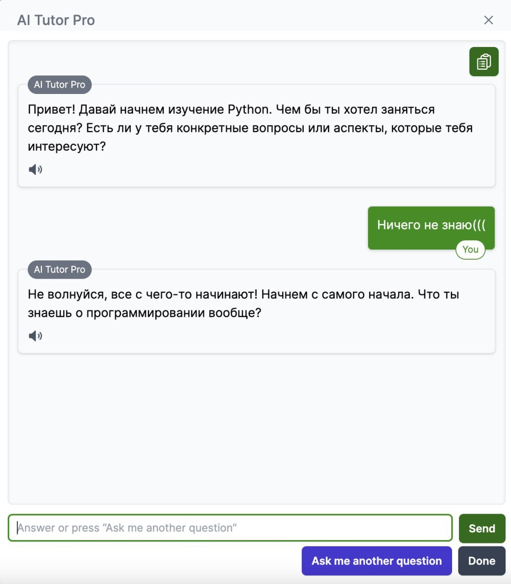 ИИ-репититор работает предельно понятно — вы просто пишите нужную тему, свой уровень знаний и начинаете учиться в удобной форме. Есть русский язык, что является несомненным плюсом этого инструмента. При помощи репетитора вы сможете проверить свой уровень знаний по любой теме.