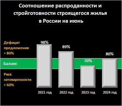 Коэффициент распроданности и строительной готовности строящегося жилья в многоквартирных домах, где уровень более 80% указывает на дефицит предложений, а менее 60% — на риск затоваривания, в июне составляет 80%, это показатель снизился с января на 2% и находится в крайней верхней зоне баланса соотношения распроданности и строительной готовности.