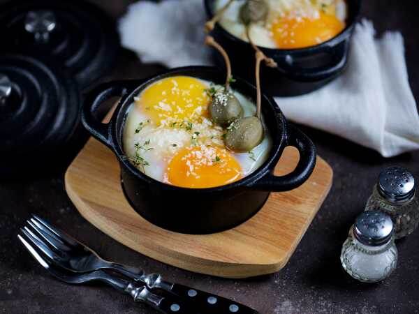 Сверху на помидор выложите по большому ломтю моцареллы.Слегка присыпьте моцареллу пармезаном, растирая его между пальцами.Разбейте по одному яйцу в форму для запекания, а если позволяет, то вбейте еще по одному яйцу. Поставьте формы в разогретую духовку и запекайте при 200 градусах 10-15 минут. Смотрите по своей духовке, желток должен остаться жидким.Посыпаем яйца свежим тимьяном, пармезаном и либо нарубленными каперсами, либо кладем плоды каперсов по 1-2 штуки в каждую порцию.Подаем готовые яйца по-неаполитански сразу же после приготовления с гренками или свежайшим хлебушком