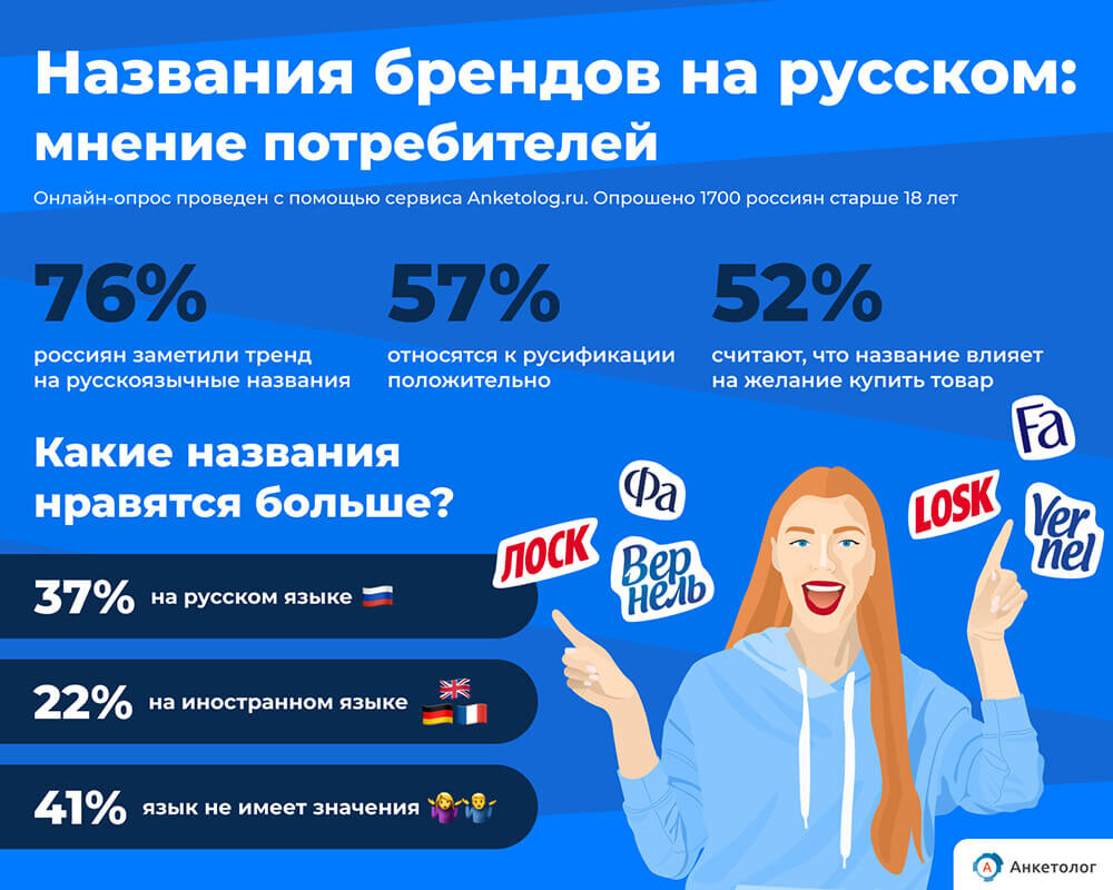 В последние два года некоторые зарубежные бренды поменяли свои названия на русскоязычные. Как россияне относятся к такому ренеймингу – узнали в новом опросе. С 2022 года с российского рынка ушли многие международные компании. Некоторые из них продали российскую долю бизнеса местному менеджменту или бизнесменам из стран, дружественных России. При этом изменились названия любимых брендов. Например, Zara стала Maag, а Bershka – ECRU. Более половины (56%) потребителей относятся к такому ренеймингу нейтрально. Другая часть брендов поступила проще: переписала привычные и запомнившиеся названия на кириллице, то есть русскими буквами: Вернель, Лоск, Тафт. Большинство (76%) опрошенных россиян заметили этот тренд, и более половины (57%) относятся положительно к переименованию на русский язык. Еще 37% выразили нейтрально отношение, а 6% – негативное. Напротив, больше нравятся иноязычные названия 22%. А для 41% язык не имеет значения. Что важно, 52% россиян считают, что название бренда влияет на ж