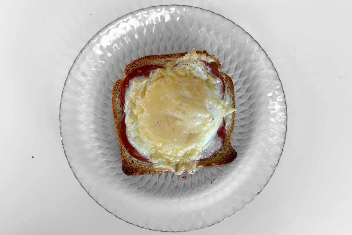 Для такого бутерброда удобнее всего использовать тостовый хлеб. Также пригодится круглая форма, чтобы проделать отверстие в середине хлеба. Сыр гауда 15—20 г Салями 3—4 ломтика Тостовый хлеб1 ломтик Яйца 1 шт. Соль по вкусу Перец по вкусу Укроп или зеленый лук для украшения Шаг 1. Разогрейте духовку до 200 °C. Застелите противень бумагой для выпечки. Сыр натрите на терке. Шаг 2. Проделайте в середине куска хлеба дырку. Выложите колбасу на хлеб так, чтобы ее закрыть. Вырезанный мякиш можно поджарить и макать в готовое яйцо Я разложил салями внахлест, чтобы яйцо не протекло Шаг 3. Выложите поверх колбасы сырое яйцо, посолите и поперчите. Посыпьте тертым сыром. Шаг 4. Запекайте бутерброд в духовке 12—15 минут, пока яйцо не запечется.