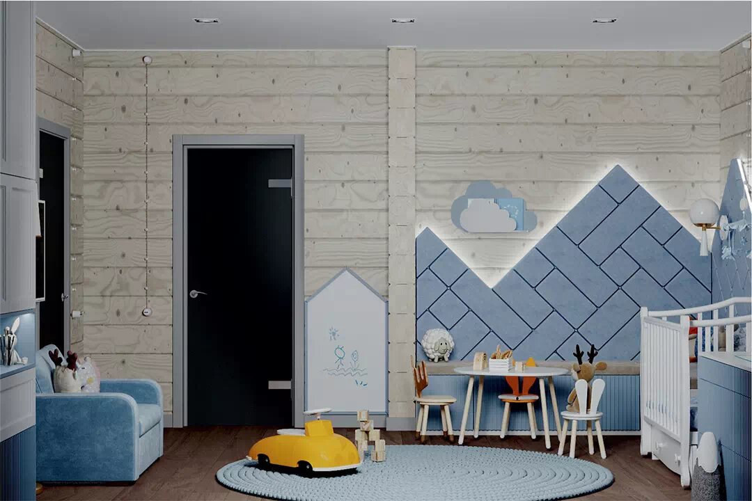 Лаконичная мебель для новорожденного с индивидуальным дизайном, удобным зонированием с перспективой взросления ребенка. Описание тут Мебель в детскую новорожденного мальчика имеет бело-голубое оформление. Оно визуально увеличивает размеры помещения и идеально подходит под отделку стен и пола в фактуре светлого дерева. Основное освещение обеспечивают встроенные потолочные светильники. Функцию дополнительных источников света выполняют парные бра со сферическими плафонами из белоснежного стекла и торшер с конусным абажуром на золотой стойке. Особый уют окружающей обстановке придает круглый нежно-голубой коврик с крупновязанной рельефной фактурой. Область справа от входной двери представляет собой пространство, обустроенное для комфортного отдыха. На стене размещен телевизор. Под ним установлено большое уютное кресло. Эта мебель в комнату малыша пока предназначается для мамы, которой будет удобно держать кроху на руках, сидя на просторном сиденье. Подлокотники – мягкие и широкие. Невысокую