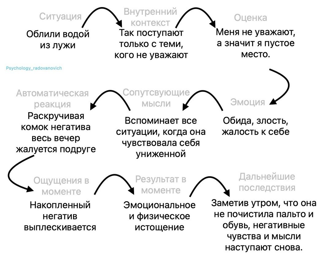 Чтобы стрессовые ситуации обладали менее разрушительным действием, можно овладеть некоторыми навыками, способными давать конструктивную реакцию, отвечающую контексту ситуации и собственным ценностям. Проще говоря, необходимо обучиться направлять свое внимание на то, что происходит здесь и сейчас без какой-либо оценки, чтобы найти пути решения, способные снизить негативное воздействие возникшей ситуации. Чтобы понять, что такое навыки эмоциональной регуляции, лучше всего начать от неконструктивной эмоциональной регуляции. На каждую ситуацию, любой человек, выдает какую-то реакцию. Эта реакция чаще всего основана на суждениях и оценках. Это автоматическая саморегуляция, которая чаще лишь усугубляет состояние и усиливает стресс. Пример. Идя домой по улице, Лора попадает в ситуацию, когда проезжающая мимо машина обливает ее водой. Получая брызги на одежду Лора сразу дает негативную оценку произошедшему. Оценивая ситуацию, у Лоры в мыслях автоматически всплывают моменты, когда она чувствова