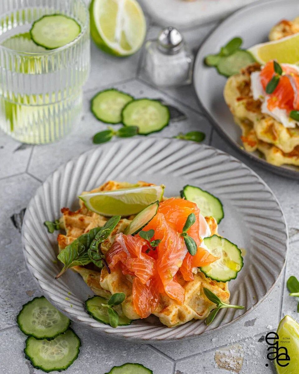 Ингредиенты: Кабачок 250 гр. Сыр Чеддер 60 гр. Яйцо 1 шт. Мука 150 гр. Соль щепотка Сливки 10% 120 гр. Сливочный сыр 100 гр. Семга 120 гр. Микро кресс для подачи Свежий огурец для подачи Рецепт: 1. Свежий кабачок натрите на крупной терке, слегка посолите и оставьте на 15-20 минут, а затем отожмите всю лишнюю жидкость. 2. Добавьте к кабачку яйцо и натертый сыр, перемешайте. 3. Влейте сливки и еще раз перемешайте. 4. Затем всыпьте муку и замесите тесто, оно должно быть густым и однородным. 5. Разогрейте мультипекать или вафельницу с соответствующими формочками. 6. Выпекайте вафли в течение 5-6 минут до готовности и румяной корочки. 7. Готовые вафли подавайте смазав сливочным сыром и украсив ломтиками семги и зеленью. 8. Сразу подавайте к столу Приятного аппетита!)