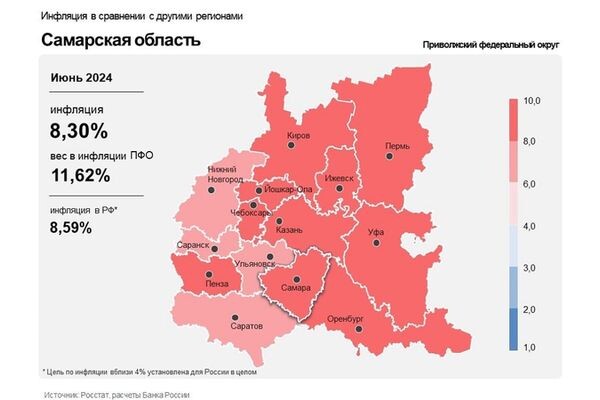 В июне 2024 года инфляция в регионе выросла до 8,3% В июне 2024 года в Самарской области инфляция увеличилась и составила 8,3% после 8,01% в мае. Тем не менее, она осталась ниже, чем в целом по России (8,59%), и соответствовала показателю по Приволжскому федеральному округу. Как отметили 18 июля 2024 года аналитики ЦБ, цены на продукты в июне выросли на 8,63% после 8,28% в мае из-за увеличения издержек производителей и поставщиков продуктов питания, а также сокращения предложения некоторых овощей. Вместе с тем цены на помидоры снижались не так заметно, как в 2023 году. К тому же, из-за засухи в южных регионах урожайность томатов в открытом грунте снизилась, что привело к сокращению поставок на рынок. Кроме того, возросли затраты на транспортировку и хранение овощей и фруктов. Поэтому в годовом сопоставлении помидоры, бананы и яблоки подорожали сильнее, чем месяцем ранее. Из-за продолжающегося роста затрат предприятий молочной отрасли, в том числе на оплату труда, сырье и логистику, под