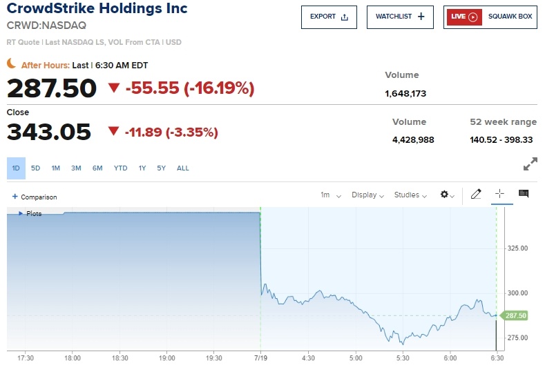 Акции CrowdStrike упали на 20% на премаркете после того, как крупный сбой в работе затронул предприятия по всему миру Компания CrowdStrike, специализирующаяся на кибербезопасности испытала резкое падение своих акций в пятницу, после того как обновление привело к крупному сбою, затронувшему предприятия по всему миру. Акции компании, которая производит программное обеспечение, помогающее компаниям управлять безопасностью в ИТ-средах, упали на 20% на предварительных торгах в США. Microsoft которая также сообщила о проблемах, затронувших ее облачные сервисы Azure и пакет приложений Microsoft 365, упали на 2,5 % на премаркете. В пятницу утром ряд различных веб-сайтов были недоступны, самолеты были вынуждены приземлиться, а телестудии приостановили вещание в результате продолжающегося серьезного сбоя в работе информационных систем. Ранее в пятницу компания CrowdStrike столкнулась с серьезным сбоем, вызванным проблемой с обновлением, затрагивающим ее продукт Falcon Sensor, который предназначе