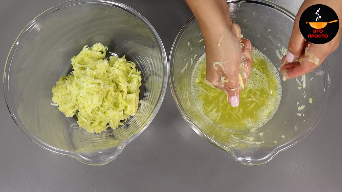Летом кабачок всегда просится ко столу, с ним можно приготовить столько вкусных блюд! Сегодня расскажу, как сделать оладьи из кабачков. Они не разваливаются, прекрасно держат форму и с добавлением одного простого ингредиента получаются более пышными, чем обычные оладьи. 👉 Я в телеграмме для быстрой связи t.me/s/eto_prosto2019 ИНГРЕДИЕНТЫ: кабачки - 1-2 шт. (750 г) соль - по вкусу перец чёрный молотый - по вкусу яйца - 2 шт. сыр твёрдый - 100 г мука - 50 г манная крупа - 30 г растительное масло - для жарки СПОСОБ ПРИГОТОВЛЕНИЯ: Берём один большой молодой кабачок весом 750 г, либо 2 средних кабачка. Натираем на крупной тёрке и пересыпаем в миску. Далее кабачок солим, перемешиваем и оставляем на 5-7 минут. Он пустит сок, который теперь необходимо отжать. Я рекомендую это делать, чтобы получить более густое тесто, которое лучше держит форму при жарке. Также отжатый кабачок концентрирует свой вкус, делая оладьи более ароматными. Теперь к отжатому кабачку добавляем 100 г любого сыра, чёрный