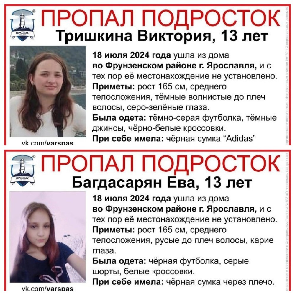Как сообщают волонтеры отряда «ЯрСпас», девочки ушли из дома во Фрунзенском районе Ярославля в четверг, 18 июля, и с тех пор их местонахождение не установлено. Рост Виктории Тришкиной 165 сантиметров, телосложение среднее. Волосы темные, волнистые, до плеч, глаза серо-зеленые. Девочка была одета темно-серую футболку, темные джинсы и черно-белые кроссовки. При себе имела сумку с надписью Adidas. Рост Евы Багдасарян также 165 сантиметров. Волосы русые, до плеч, глаза карие. Телосложение среднее. Была одета в черную футболку, серые шорты и белые кроссовки. Девочка имела черную сумку через плечо. Если вам что-то известно о местонахождении пропавших, или вы видели Викторию и Еву после 18 июля – позвоните по телефонам: 02, 102, 112 – полиция или 8-910-964-08-38 – горячая линия отряда «ЯрСпас».