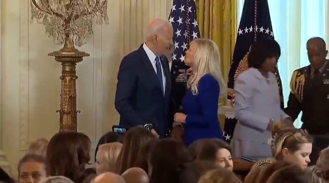 В какой-то момент Байден неформально схватил за руку женщину, одетую точно так же, как его жена. Только это была пепельная блондинка, а костюм — более яркий.