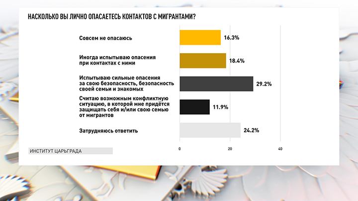 Хуже того, почти 12% респондентов считают возможной конфликтную ситуацию, в которой им придётся лично защищать себя и свою семью от мигрантов.