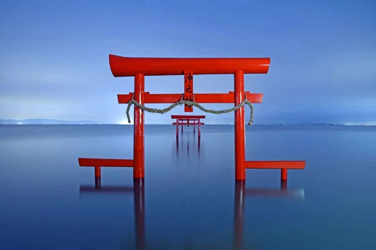 Установленные в море Ариаке, три алых тории храма Оуо обладают потусторонним очарованием. Во время прилива три тории храма Ооуо в Саге будто плывут по поверхности моря Ариакэ. В это время создается волшебная атмосфера, словно храм окутанкый водным туманом, взволнован приливом. Но когда приходит отлив, и вода отступает, то открывается возможность прогуляться у величественных ворот и в их близи. Это удивительное зрелище подчеркивает красоту и величие этого места. Разнообразие пейзажей, вызванное приливом и отливом, делает храм популярным среди тех, кто стремится наблюдать природные явления и запечатлеть их на фотографиях. Согласно легенде, около трех веков назад местные жители пригласили коррумпированного магистрата на вечеринку на соседнем острове Окиносима. Заманив его в отдаленное место, люди напоили его и бросили на произвол судьбы. Судья молился о спасении, и гигантская рыба пришла ему на помощь. В знак благодарности он построил святилище Оуо, что буквально означает «большое рыбье с